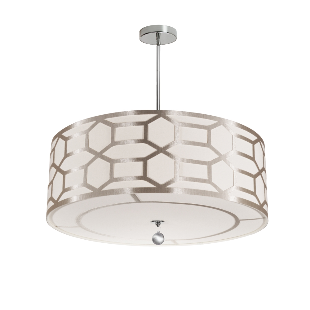 Whether commercial or residential, Dainolite will add a unique touch to any space with this 24-in 4-light pendant drum shade with geometric laminated trim winter gold (pebble and cream).